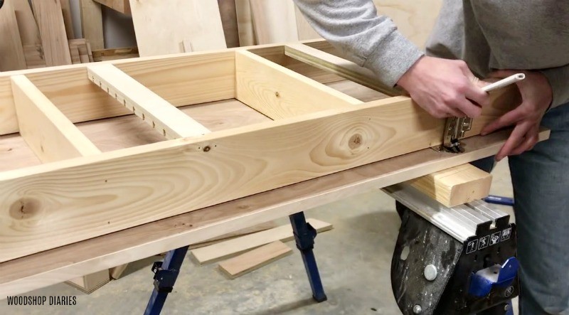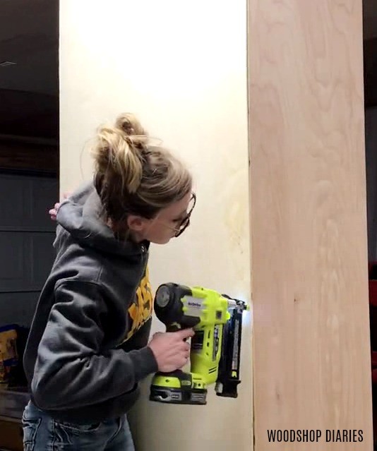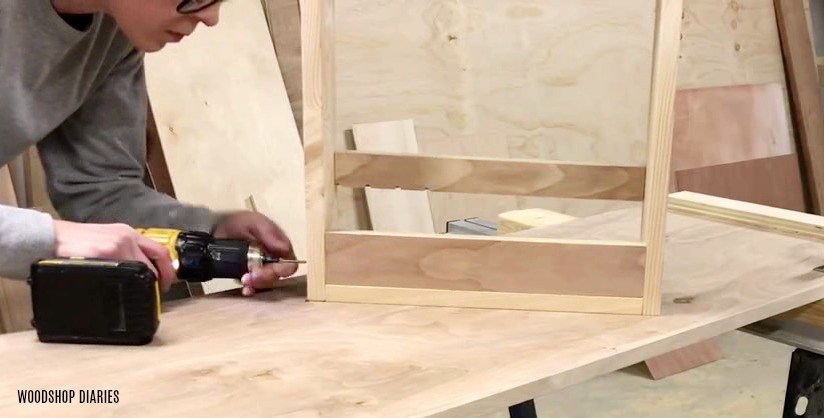 In order to do this, you will need to have a board running between the sides at the top of the two cabinet sides. You can see this in the plans, but you can use a scrap piece of ¾″ plywood and secure between the cabinet sides at the top using pocket holes and screws or simply 1 ¼″ wood screws through the cabinet sides.