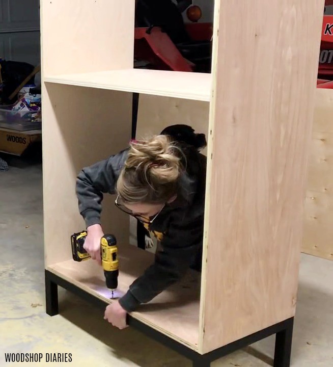 Once the cabinets were assembled, the paint was finally dry on the bases, so I attached the cabinets to be bases using 1 ¼″ wood screws like shown.