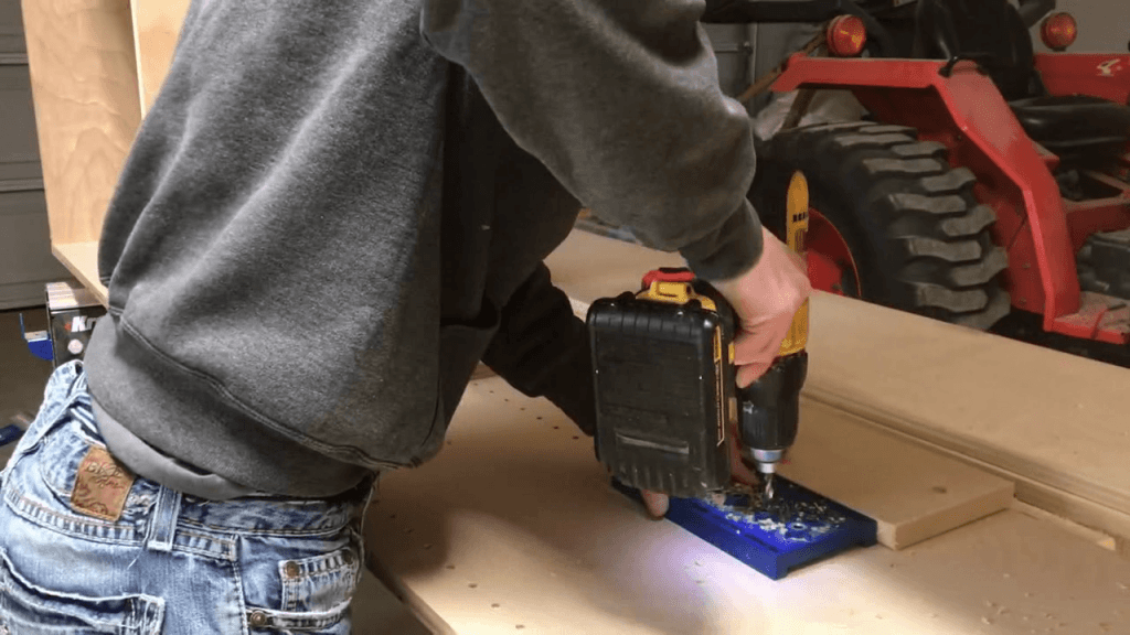 One other difference between the two types of cabinets besides the placement of the middle shelf is the shelf pin holes. For the cabinet with adjustable shelves, I added shelf pin holes using my Kreg shelf pin jig.