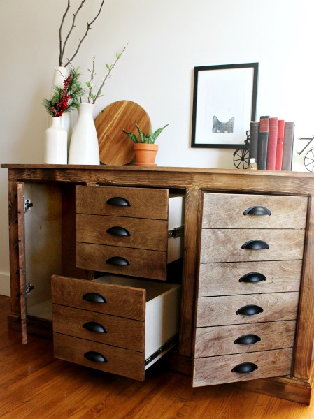 Storage pieces with a million drawers are so pretty! But, seriously, who wants to make a million drawers?? Plus, drawer slides aren’t the cheapest things in the world…and we all know, I’m cheap haha.