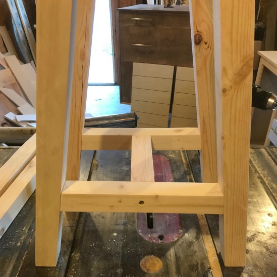 Next, cut and assemble the bottom braces for the DIY sawhorse table base…