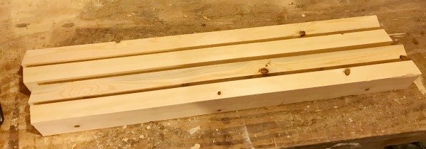You can read my post here on how I build table tops. For this, just cut two pieces of your 2×8 the length you want your top to be (I made this one about 40″ long). Square off the edge (if desired), then glue together. Sand down, then it’s ready to attach.